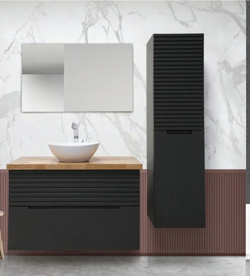 גוף סנדוויץ' חזיתות m.d.f ירוק בצבע אפוקסי + מגירות טריקה שקטה חריטה מיוחדת למגירה עליונה + משטח בוצר 4ס"מ+ מראה מרחפת מלבנית ארון שירות 40\30h\150cm