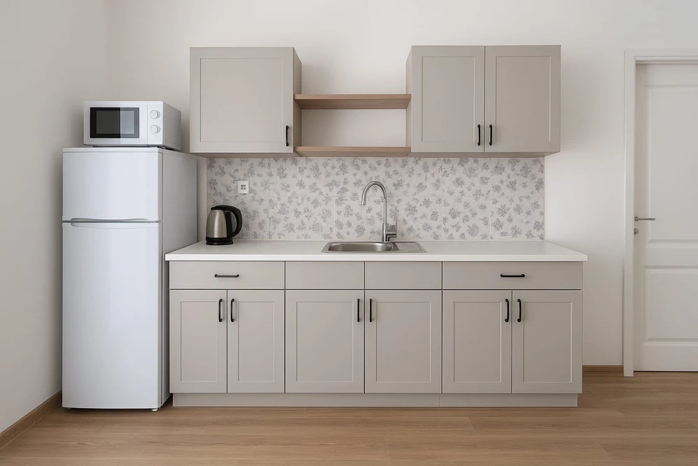 מטבח בסגנון כפרי כולל שיש אקרילי וכיור אמריקאי