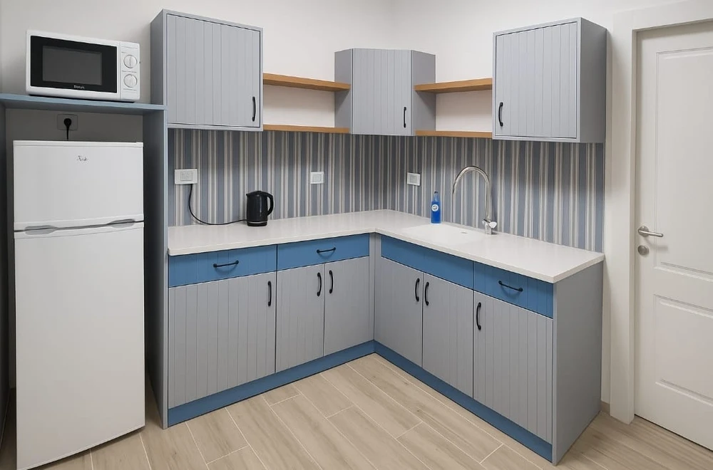 מטבח פינתי בשילוב צבעים אפור כחול ים עם מדפים פתוחים מעץ אלון